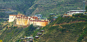 The town is built along a steep ridge and offers dramatic views of deep valleys and surrounding mountains. Dominating the landscape is Trongsa
